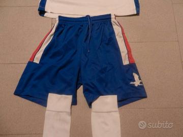 Numero 10 maglie 100x100 poliestere manica lunga taglia M - L - XL, color bianco con sponsor scritto davanti, abbinati 10 pantaloncini color blu e 10 calzettoni lunghi color bianco.
