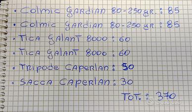 VENDO SOLO IN BLOCCO - NON SPEDISCO - NON TRATTO IL PREZZO Come da titolo vendo attrezzatura da pesca surf casting usata solamente per 7 uscite e in ottime condizioni e così composta: - Colmic Gardian 3pz + 1: Azione Medium Strong - Casting 80-200gr e Azione Strong- Casting 100-250gr; - Colmic Gardian 3pz + 1: Azione Medium Strong - Casting 80-200gr e Azione Strong- Casting 100-250gr; - Mulinello Tica Galant GBAT 8000 SURF; - Mulinello Tica Galant GBAT 8000 SURF; - Tripode Caperlan: treppiede regolabile con piedini telescopici è provvisto di alloggi per appoggiare due canne in tutta sicurezza. Piano di appoggio morbido per avere tutti gli accessori a portata di mano; - Sacca Caperlan: Fodero surfcasting con 3 scomparti distinti. è provvisto di 2 cinghie regolabili imbottite che consentono di trasportarlo comodamente in spalla. Come suddetto l'attrezzatura ha fatto in totale 7 uscite e si presenta in ottime condizioni. E' da 2 anni che non la utilizzo. Resto a Vostra disposizione per qualsivoglia necessità. VI CHIEDO LA GENTILEZZA DI NON CONTATTARMI PER CHIEDERE SE L'ATTREZZATURA SIA DISPONIBILE - FINTANTO L'ANNUNCIO E' PRESENTE E' DISPONIBILE - DUNQUE NON RISPONDERO' A RICHIESTE TALI!!!