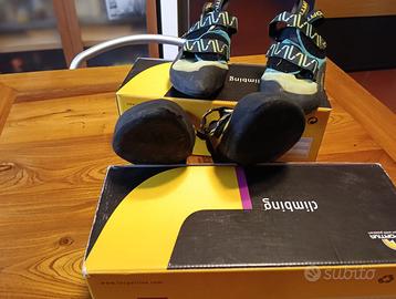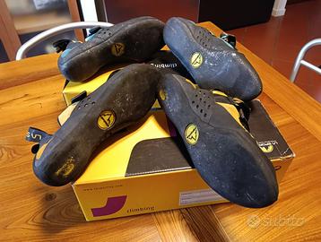 Vendo due paia di scarpette Katana La sportiva perché mia moglie ed io non arrampichiamo più. Le gialle sono state usate molto meno, come si vede dall'adesivo ancora presente nella suola, sul tallone.