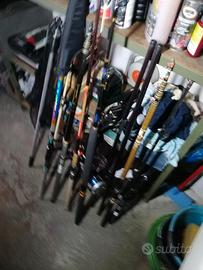 9 canne di cui una da traina 50 lbs Nuova Mai usata + altre 8 di cui una trabucco da aguglie con 3 cimini + altre 7 di cui due fisse daiwa 3 e 4 metri + una 2.70 metri nuova Mai usata. Tutte le canne tranne le le due fisse e una da lago sono dotate di mulinello e sono tutte in buone ottime condizioni e custodite in luogo asciutto. Inoltre una cassetta rossa e grossa piena di ami, filo, galleggianti e bobine di ricambio.
