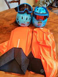 Vendesi, come da foto 2 coppie di casco, occhiali e protezione da sci per bambino. Protezione da sci decathlon taglia S. Il tutto usato ma tenuto perfettamente. Prezzo 30 euro ( 1 casco, 1 paio di occhiali e 1 protezione) Consegna a mano zona casello A1 Valdarno.