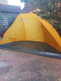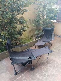 Vendo in blocco due poltroncine reclinabili, una pompa per materassini, sei picchetti antivento da 25 cm per tenda mai usati, una lampada a gas con cartuccia nuova, un fornelletto senza bombola, una doccetta portatile a sacca, una tenda da spiaggia larga 250 cm alta 125 cm e profonda 125 cm.