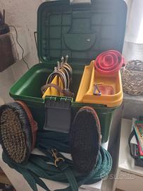 Borsa rigida completa di accessori per la pulizia del cavallo, con speroni, frusta lingua...