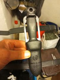 Muta Subea intera 5 mm taglia 3 XL con cerniera anteriore, completa di calzari e guanti Subea, taglia calzari 45, gilet zavorra porta piombi portata 6 kg e cintura in gomma, Otto piombi da un kg, il gilet si aggancia alla cintura lombare con un attacco in plastica simile agli zaini, coltello, fiocina per polpi, chiodo porta prede, pallone con sagola e tasca sulla parte superiore porta oggetti, busta impermeabile porta documenti ed oggetti, pinne misura 46/47, maschera e boccaglio.