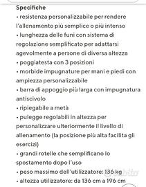 resistenza personalizzabile per rendere I'allenamento più semplice o più intenso . lunghezza delle funi con sistema di egolazione semplificato per adattarsi A diversa altezza agevolmente a persone