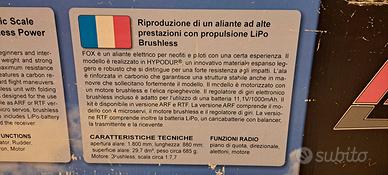 Aliante ad alte prestazioni Fox della Hype. Apertura alare 1800 mm., lunghezza 880 mm, motore brushless potenziato, quattro servi rinforzati. Vicino Piazzale Clodio. Giancarlo 3384703912