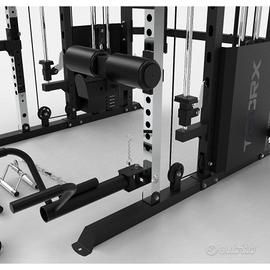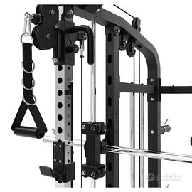 DOTAZIONI/NOTE: 3-IN-1 dual pulley, smith machine, rack. 2 J-hook, coppia fermi di sicurezza bilanciere con rulli gambe in foam, barra trazioni, parallele, porta bilanciere, 6 porta dischi ø50 mm o 25 mm. Attachments: cavigliera, corda, landmine, 2 maniglie trazioni regolabili, barra tricipiti, barra tricipiti dritta, bilanciere e bilanciere CURL.