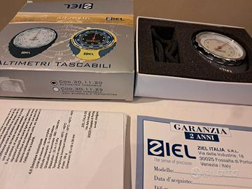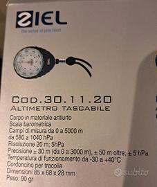 ZIEL COD.30.11.20 Altimetro Barometro tascabile Corpo in materiale antiurto Scala barometrica Campi di misura da 0 a 5000 m da 580 a 1040 hPa Risoluzione 20 m; 5hPa Precisione ± 30 m (da 0 a 3000 m), ± 50 m oltre; ± 5 hPa Cordoncino per tracolla Dimensioni 85 x 68 x 28 mm Peso: 90 gr Nuovo, mai utilizzato