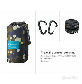 Ogni amaca include robuste cinghie e moschettoni, che la rendono facile e veloce da montare e smontare.