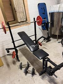 Panca regolabile per allenare petto e gambe con dischi che arrivano fino a 50 chili, conpresi nel prezzo anche due manubri.. prezzo trattabile