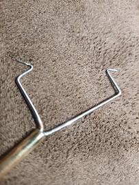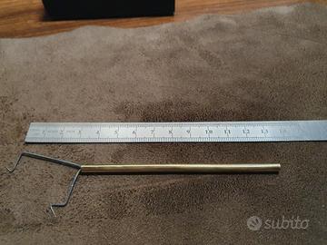 Fatto a mano. Filo in acciaio appuntito tramite elettroerosione. Manico ottone lucidato. Incredibilmente pratico ed essenziale.