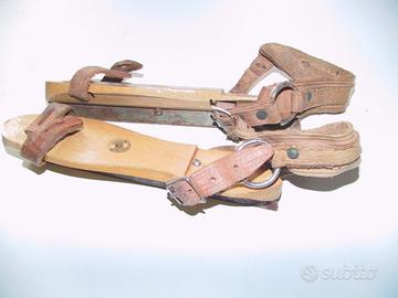 Un paio di antichi e rarissimi pattini da ghiaccio in legno da bambino completi di cinghie in cuoio per il fissaggio della scarpa.