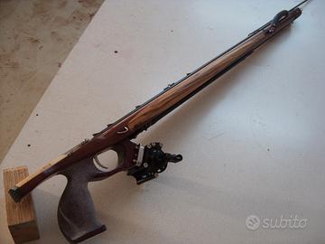 Arbalete da 85 con propulsione Fusion FK1 in lamellare di frassino, okumè, iroko e frassino olivato con impugnatura dx in padouk allestito con meccanismo autocostruito, pulegge senza cuscinetti e mulinello verticale LGsub, asta Devoto Ergot 120x6,5 ed elastici Epsealon Maori da 18 superiormente (con vincolo interno) e da 16 inferiormente.