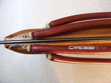 Arbalete doppio elastico 105 in lamellare di okumè, doussier e frassino allestito con asta Devoto Ergot 135*7 doppia aletta, elastici Cressi Pure Scarlet da 15, mulinello Ermes Albatros alto e meccanismo Ermes Future double roll.