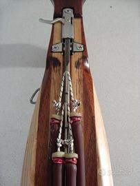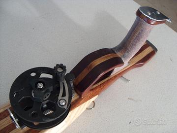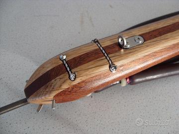 Arbalete doppio elastico da 88 in lamellare di frassino, mogano e rovere allestito con meccanismo di sgancio Ermes double roll, mulinello Ermes Albatros 80 basso, asta Salvimar Capture 125*6.25 monoaletta inferiore ed elastici Cressi Pure Brown da 14 tirati al 320%, peso gr. 2280, assetto neutro.