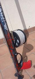 Fusto in carbonio con guida asta, doppio elastico nuovo salvimar 16 mm s400, mulinello picasso caricato con 70 metri di dyneema da 1.5 mm, asta da 6.75 mm+seconda asta da 7 mm, galleggiante seac.