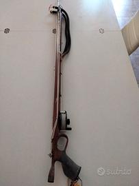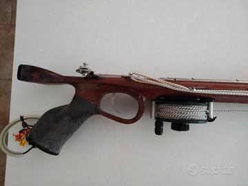 vendo arbalete roller Donatello Pugliese misura 95, fusto in mogano, 2 aste da 7 mm con pinnette (una con aletta superiore ed una con aletta inferiore), mulinello lg con 50 m di dynema da 1mm, elastico da 16 mm caricato al 330% + elastico nuovo di ricambio caricato al 300%, € 400,00
