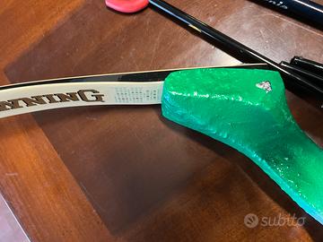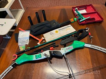 Arco da gara compreso di 9 frecce, faretra, trespolo d’appoggio, mire e ricambi per frecce.