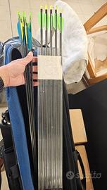 Arco compund Reflex, sia per indoor che outdoor e caccia, completo di tutti gli accessori: borsa, mirino di precisione (Booster), stabilizzatore, faretra, frecce, parabraccio e sgancia-freccia. Ottimo per chi inizia. Lungo 104cm x 27cm di larghezza.
