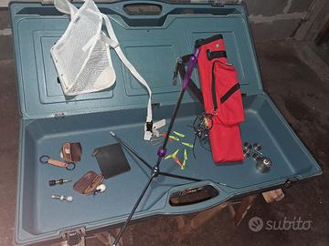 Arco nudo Spigarelli 2001 Arco,2 flettenti 23/25 libre e corda 10 frecce in carbonio easton redline 780 5 frecce in carbonio beman ics estreme 690 Custodie fatte a mano per porta arco e porta flottante 2 para dita 1 custodia porta arco 1 squadretta a T 1 dragona dita di cuoio 1 estrattore per frecce 2 bottoni Berger 3 punte di ricambio per frecce 10 alette di ricambio 1 kit pesi 1 faretra a 3 scomparti 1 spilla fitarco 1 paraseno 1 cavalletto reggi arco 1 parabraccio in privato anche altre foto .