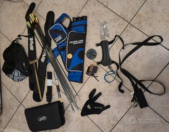 arco olimpionico più tutto l'occorrente per il tiro e la gara "riser sebastien flute+flettenti wns fc100+borsone+borsa per viaggio+mirino e stabilizzazione in carbonio+faretra+para braccio+carichino+attrezzatura varia+6 frecce pronte+6 frecce da finire. tutta l'attrezzatura è in ottime condizioni, poco usata, vendo per problemi di salute