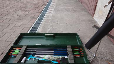 Arco scuola in legno completo di frecce in carbonio e in legno, faretra, valigetta e vari accessori