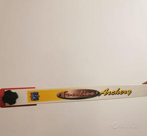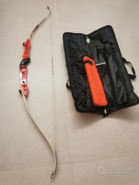 ARCO MANCINO ricurvo da competizione 70". È smontabile ed è composto da un riser ( impugnatura) in alluminio di colore rosso e flettenti bianchi completo di porta frecce e guantino tendicorda.
