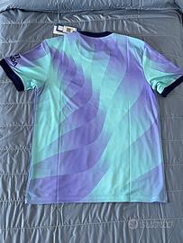 Maglia ufficiale Third Arsenal FC 2024/2025 Adidas Authentic, tecnologia HEAT.RDY per ventilazione e asciugatura rapida. Design lilla e verde acqua ispirato agli anni ’90, con cannone Arsenal e logo trifoglio.