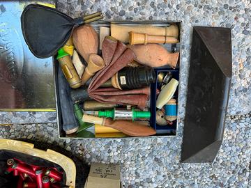 Vendo in blocco gli articoli in foto, ho anche 4 cartuccere in cuoio (cal 36-20-12)ed uno sgabello richiudibile. Consegna a mano au bologna Prezzo trattabile