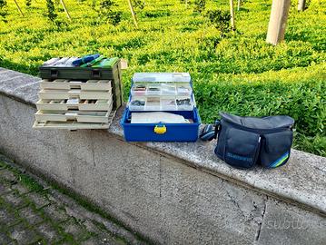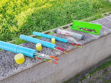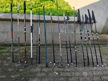 Vendo in blocco come da foto galleggianti cassette fornite numero 15 canne da pesca di vario tipo più staffe per la spiaggia e 11 mulinelli per piu info e prezzo contattare telefonicamente o su whotsapp il numero 3288220822