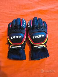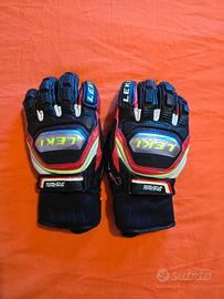 2.Guanti in pelle Leki Worldcup Speed taglia 8.5, di colore nero, rosso e giallo. Protezioni rinforzate per le dita e per il dorso della mano. Allaccio rapido trigger-s per i bastoncini da sci leki compatibili.
