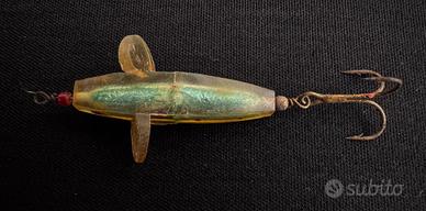 Vendo artificiale da pesca vintage risalente agli anni ’60/’70, modello europeo rotante in plastica trasparente con interno metallizzato. Pezzo originale dell’epoca, non restaurato.