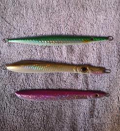 3 ARTIFICIALI DA PESCA VARI COLORI E PESI, SLOW, VERTICAL JIGING. USATI POCHISSIMO SENZA SEGNI E VISIBILI IN FOTO. COLORI E PESO: MAGENTA 99gr VERDE 113gr ORO 113gr VENGONO FORNITI SENZA AMI.