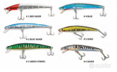 Artificiali spinning popping traina tonni,totanare 1)Esca dotata di una duplice azione: oscillazione e rotolamento. Il nuoto ottimale combinato con la sua finitura realistica fanno di questo un infallibile artificiale Montato con amo 7/0 o 8/0 e 2 m di filo 56kg (130lbs) Disponibili 2 misure e varie colorazioni 100mm, 45g, montato con amo 7/0 e fluorocarbon 130Lb 150mm, 90g, montato con amo 8/0 e fluorocarbon 130Lb Un esca indispensabile per la pesca del tonno prezzo 7 euro 2)Artificiale minnows traina spinning prezzo 3 euro MISURE:CM7 GR7-CM7 GR15-CM11 GR15 LE ESCHE SI DISTINGUONO PER LE CARATTERISTICHE DI COSTRUZIONE LA SCELTA DI MATERIALI DI PRIMA QUALITA'.LE FINITURE ACCURATE,LA DINAMICA IN ACQUA DEFINITA IN BASE AD ATTENTI TEST.SONO ARTIFICIALI CON UNA ECCEZIONALE VIBRAZIONE COMBINATA AD UN MOVIMENTO ONDULATORIO,CHE LI RENDE IRRESISTIBILI A TUTTI I PREDATORI.IL MAGGIOR PREGIO DI QUESTI ARTIFICIALI E' LA PERFEZIONE DEL VOLO IN FASE DI LANCIO,CHE CONSENTE DI RAGGIUNGERE DISTANZE NOTEVOLI,SENZA FALLIMENTI.GRAZIE AL LORO COLORE RIFLITTENTE HANNO UN FORTE POTENZIALE NELLA FASE DI ATTIRAMENTO DELLA PREDA. 3)Totanara natural soft squid jig prezzo 2 euro L'innovazione nella pesca! Totanara NATURAL SOFT SQUID JIG in silicone morbido rivestito esternamente di un filato in vari colori ideale per la pesca al calamaro e alla seppia. Questa innovativa totanara da alla preda la sensazione di stare braccando un vero pesciolino, anche grazie alla perfetta galleggiabilità data dal silicone, e per questo di attaccare con maggior decisione. Alzando e abbassando velocemente la canna, la Natural Soft Squid Jig nuota come un vero pesciolino per attrarre immediatamente la preda! Nessun calamaro e nessuna seppia riusciranno a scappare dalla trappola. Totanara di buona costruzione, con le doppie spugnette (coroncine) in acciaio. Si trova nei colori: Rosso - Giallo/Marrone - Bianco/Rosso - Verde/Blu - Blu/Giallo/Rosso - Blu/Viola Sono tutte da 7 cm - 4 gr Contattare per informazioni.