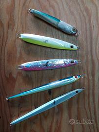 vendo in blocco n.5 artificiali per vertical jigging. n.1 searock 150gr, n.2 butterfly shimano 160gr, n.1 butterfly long shimano 120gr, n.1 spike long 150gr. vendo in blocco non separatamente.