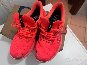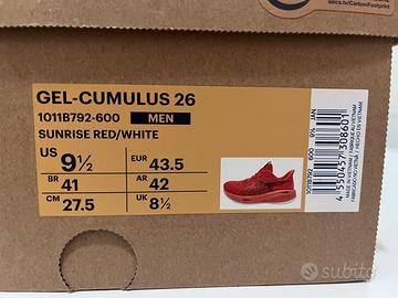 Asics Cumulus 26, taglia eu 43.5, vendo in ottime condizioni con scatola originale come da foto. Km percorsi monitorati in base alle uscite: 250 km.
