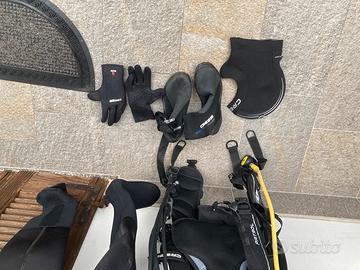 Salve vendo atrezzatura da sub per motivi di salute tutto in blocco come da foto 5 immersioni fatte con questo equipaggiamento (muta stagna altezza 1.73,1.78 ,cappuccio ,guanti ,calzari 43 ,erogatori 2 compiuters , jaket ,bussola vendo tutto in blocco1000 euro mail vincenzovolpe111857@gmail.com
