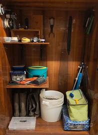 Retini, secchiello, trampoli, forbici, pinze, slamatore e utensili.