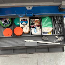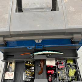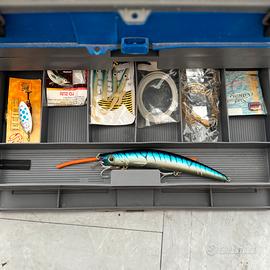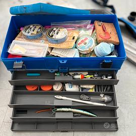 Vendo cassetta con attrezzatura da pesca, esche artificiali nuove di varie misure, ami, fili in bobine varie misure , attrezzi e minuterie varie, il tutto mai usato ( dotazione dalla barca mai usata)