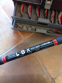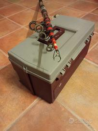 attrezzatura da pesca vintage composto da una canna da 3,60mt con mulinello (ultimo anello nel cimino da sostituire)e una valigetta box della plano model 707 in ottime condizioni con tutto il suo contenuto interno(esche finte,piombi,ami,lenze ecc.).