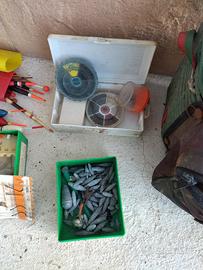 vendo in blocco piccolo lotto di attrezzatura da pesca...cestino,ami,piombi,galleggianti,cucchiaini e un muletto... disponibili altre foto su richiesta