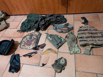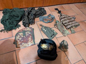 14 pezzi totali: occhialini maschera protettiva giacca pantaloni gilè militare rigido ginocchiere usurate porta colpi copri braccia e varie borsette porta cose -- Vendo TUTTO INSIEME... RITIRO A MANO A OSTIA (RM) poco trattabile