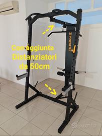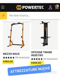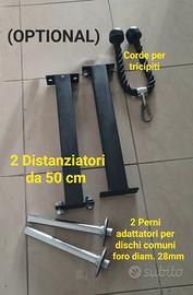 Vendo Half Rack System POWERTEC in condizioni impeccabili pari al nuovo. Colore nero. Half rack powertec con lat machine e pulley basso. Il Kit Workbench Half Rack System Include: - Half Rack (che comprende la sbarra, gli appoggi per il bilanciere e i bracci di sicurezza) - Colonna Lat / Pulley Machine, completa di barra larga, barra corta. - Connettore WB-LTO-HR18-CN per collegare la Lat tower all'Half Rack. Le misure, complete dell'attrezzo montato sono le seguenti: Dimensioni half rack (L x P x A): 91 x 126 x 211 (cm). Capacità massima di peso: barra per trazioni: 180 kg. Portapesi: 450 kg. Dimensioni Lat Tower (L x P x A): 84 x 104 x 203 (cm). Capacità massima di peso: 227 kg. Sezioni tubolari: 6x6 cm, spessore acciaio 3mm. Vendo a Euro 750 NON SPEDISCO, RITIRO A MANO A SAN DONÀ DI PIAVE (VENEZIA) In aggiunta optional: - N.2 perni adattatori per dischi comuni da diametro foro 28mm - N.2 distanziatori da 50cm da collocare tra la Lat Tower e Half Rack con i bulloni necessari al fissaggio - N.1 corda per tricipiti VENDO in BLOCCO gli OPTIONAL a Euro 100