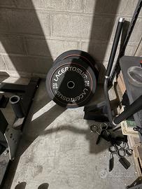 L'attrezzatura comprende: - Half Rack completo di safety bar, trazioni e dip station (venduto); - Panca inclinabile (venduto); - Coppia di manubri carico libero; - Bilanciere bodybuilding; - Bilanciere esagonale EZ (venduto); - Tre tappeti da stacco gomma 5cm 1mx1m - Accessorio T-bar (venduto); - Leva per scaricare bilanciere stacco; - Coppia di dischi bumper 25 (venduto); - Coppia di dischi bumper 15 (venduto); - Coppia di dischi bumper 10; - 8 coppie non bumper dischi 5kg; - 2 coppie non bumper dischi 2.5kg (venduto); - 2 coppie non bumper dischi 1.25kg (venduto); - 4 coppie molle chiusura bilanciere;