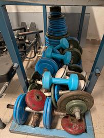 Attrezzatura per palestra, comprendente pesi, panca dritta, panca inclinata, Leg curl, Leg estention, AB Rocket, Manubri, Aste e tutto ciò che si vede in foto. Vendita in blocco non si divide