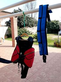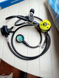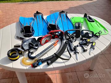 Muta da uomo tg. 54/56, Muta da donna tg.m/l, gilet con alloggio bombola, cintura porta pesi, doppio erogatore con manometro, pinne 44/46, guanti da uomo e da donna, varie maschere e respiratori, calzature n.44/46 e 39/40. Ritiro e pagamento in loco.