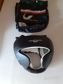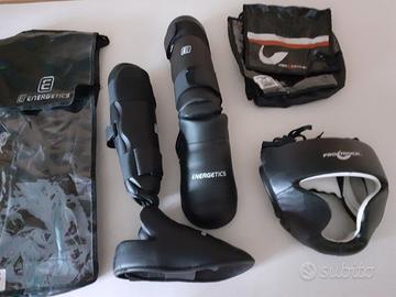 Paratibie + parapiedi marca Energetics MMA colore nero taglia M, casco paracolpi marca MMA Pro Touch Protezione Totale Testa colore nero taglia M, vendesi per passaggio ad altra disciplina sportiva. Usati poche volte .