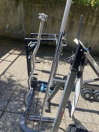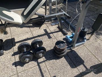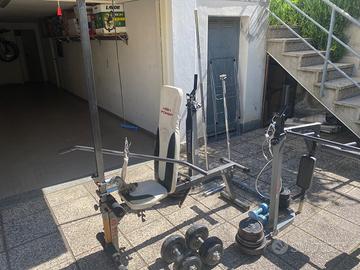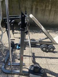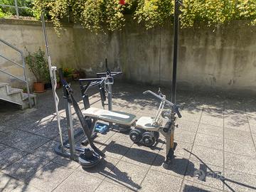 Vendo per inutilizzo attrezzatura per fare la palestra a casa in poco spazio. Il set è l’ideale per fare tutti gli esercizi ed è composto da: 1 panca con schienale e seduta inclinabile - 1 supporto per bilanciere con possibilità di alzarlo - 64kg di pesi in ghisa composti da 2 dischi da 10kg, 4 dischi da 5kg, 8 dischi da 2 kg, 4 dischi da 1kg, 8 dischi da 0.5 kg - 1 bilanciere da metri 1.80 - 1 bilanciere a Z per bicipiti - 2 manubri - 2 manubri da 4kg l’uno - 2 manubri da 10kg l’uno - torre ancorata alla panca per lat machine e trazioni ai cavi - cintura - maniglia per trazioni - attrezzo da muro per trazioni alla sbarra e dip.