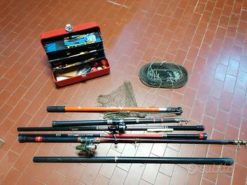 Vendo attrezzatura varia da pesca. Canne da pesca con mulinello e canne fisse. Retino. Cassetta con ami, lenze e galleggiante e accessori vari.