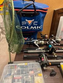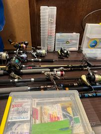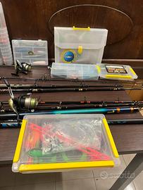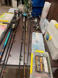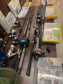 Per cessato hobby vendo tutto il materiale che c’è in foto e altre cose tipo un palamito da 50 ami . Canne , mulinelli , borse , guadino , ami, piombi ,galleggianti, vari fili , svariati artificiali ,cerchietti etc etc . Non svendo e non vendo singolarmente , solo tutto in blocco .